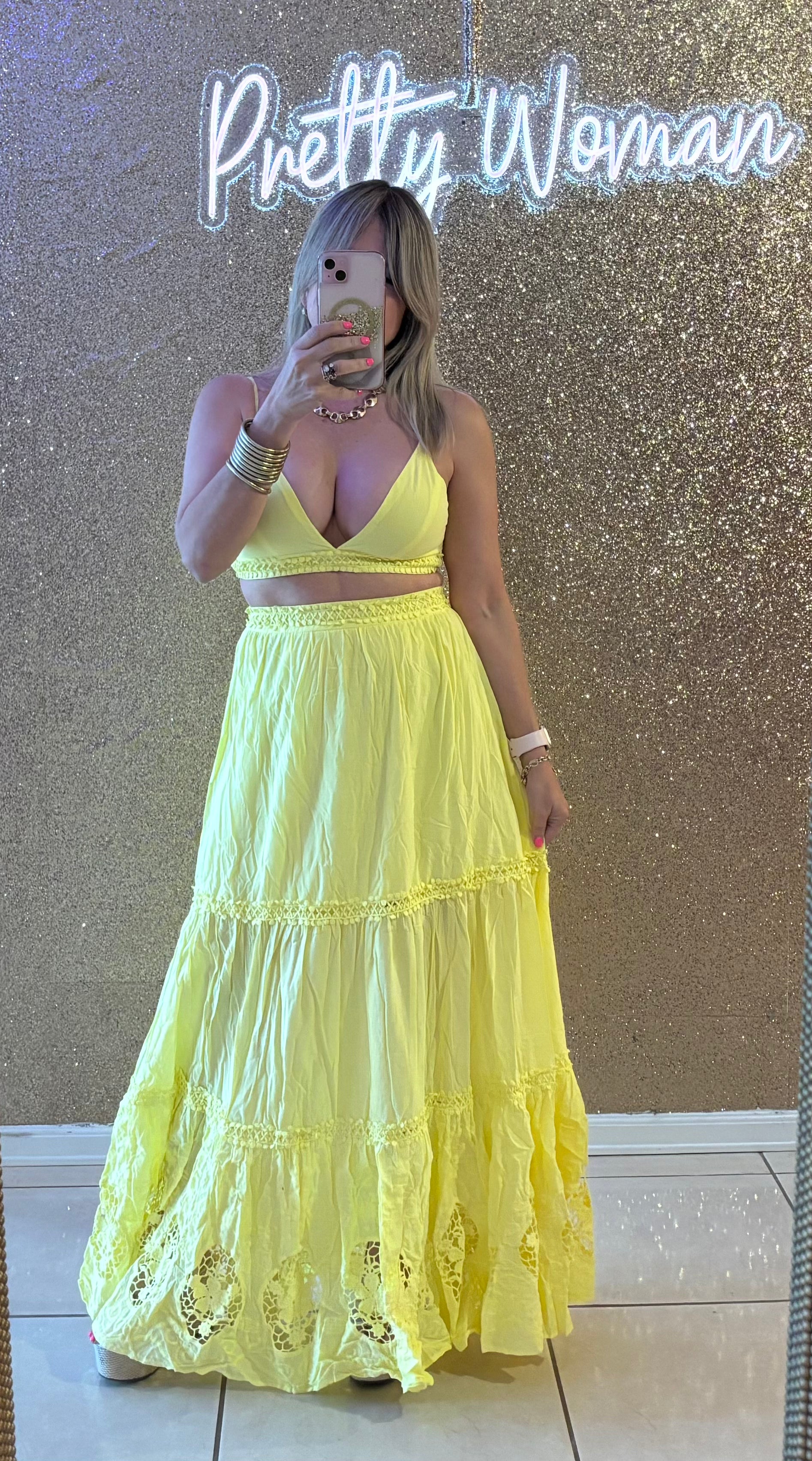 Yellow Cami Top Lace Maxi Set. High Waisted Skirt.